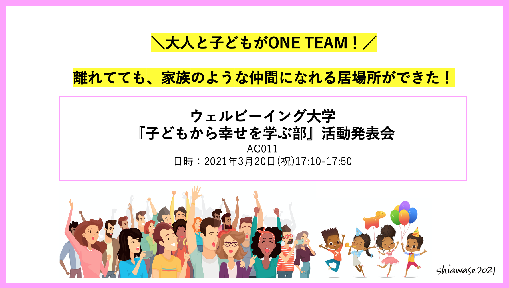 当日は、私たち『子どもから幸せを学ぶ部』の活動紹介の他、大人&子ども部員からの発表を企画していますのでお楽しみに!
